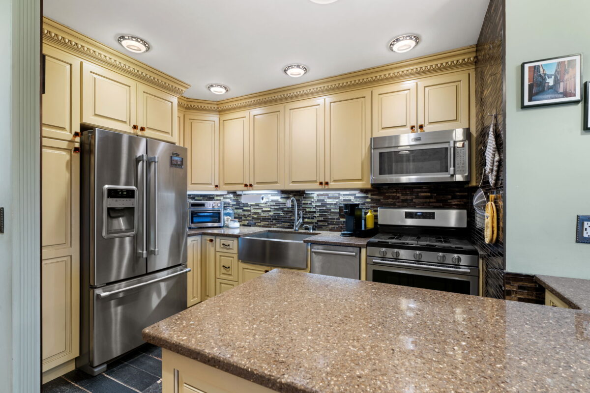 The kitchen has been fully updated with a simple, functional layout. Granite counters, custom cabinetry, and stainless appliances give it a polished look without feeling overdone. The peninsula adds prep space and casual seating, keeping everything connected to the main living area.